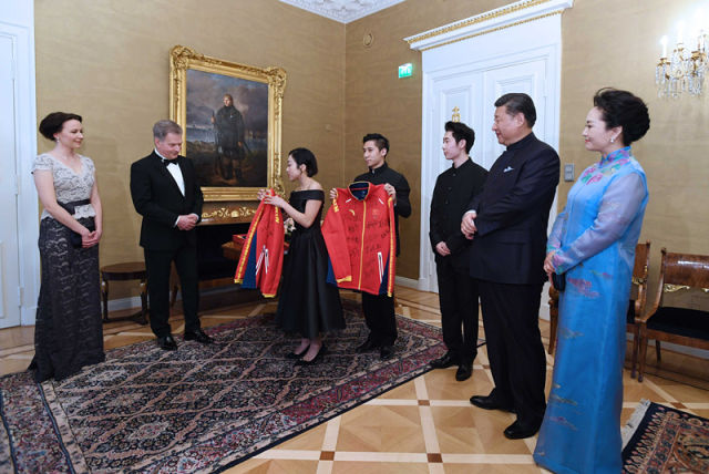 當(dāng)?shù)貢r(shí)間4月5日晚,國(guó)家主席習(xí)近平和芬蘭總統(tǒng)尼尼斯托在赫爾辛基共同會(huì)見(jiàn)剛剛參加完2017年世界花樣滑冰錦標(biāo)賽的中芬兩國(guó)冰雪運(yùn)動(dòng)員代表。習(xí)近平夫人彭麗媛和尼尼斯托夫人豪吉?dú)W參加會(huì)見(jiàn)。這是芬蘭運(yùn)動(dòng)員向習(xí)近平和夫人彭麗媛贈(zèng)送運(yùn)動(dòng)衣。(新華社記者饒愛(ài)民攝)