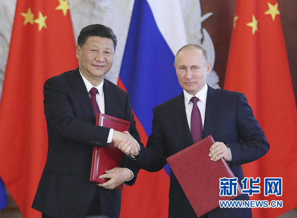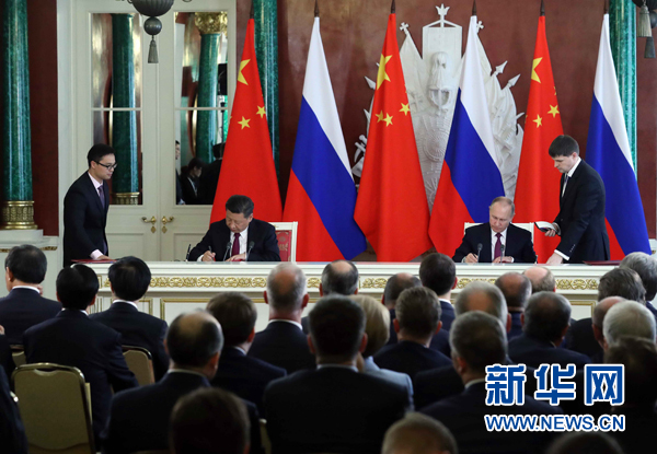 7月4日,國家主席習近平在莫斯科克里姆林宮同俄羅斯總統(tǒng)普京舉行會談。會談后,兩國元首簽署了《中華人民共和國和俄羅斯聯(lián)邦關(guān)于進一步深化全面戰(zhàn)略協(xié)作伙伴關(guān)系的聯(lián)合聲明》《中華人民共和國和俄羅斯聯(lián)邦關(guān)于當前世界形勢和重大國際問題的聯(lián)合聲明》,批準了《〈中華人民共和國和俄羅斯聯(lián)邦睦鄰友好合作條約〉實施綱要(2017年至2020年)》并見證了《中華人民共和國外交部和俄羅斯聯(lián)邦外交部關(guān)于朝鮮半島問題的聯(lián)合聲明》以及經(jīng)貿(mào)、農(nóng)業(yè)、能源、基礎(chǔ)設(shè)施建設(shè)、金融、文化、創(chuàng)新、媒體、信息網(wǎng)絡(luò)、檢驗檢疫等領(lǐng)域多項雙邊合作文件的交換。新華社記者 饒愛民 攝
