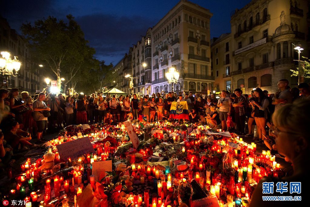 當?shù)貢r間2017年8月18日,西班牙巴塞羅那,當?shù)孛癖婞c燭獻花悼念恐襲事件遇難者。17日,一輛白色貨車在巴塞羅那市中心蘭布拉大道加泰羅尼亞廣場附近沖撞人群,據(jù)媒體報道,死亡人數(shù)已經(jīng)升至14人。(圖片來源:東方IC)
