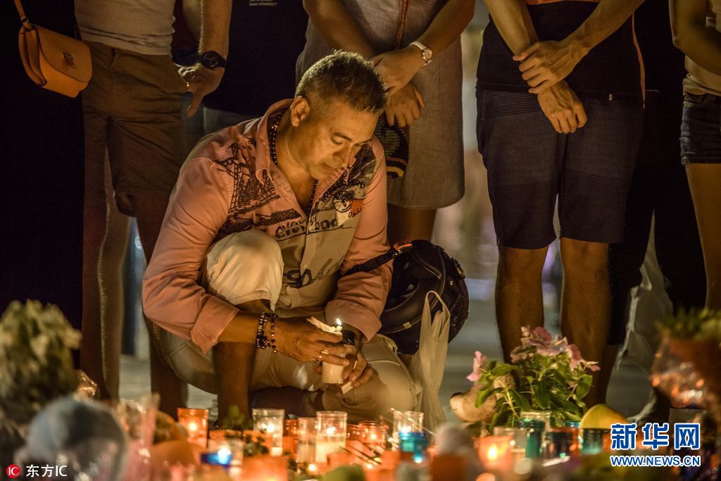 當?shù)貢r間2017年8月18日,西班牙巴塞羅那,當?shù)孛癖婞c燭獻花悼念恐襲事件遇難者。17日,一輛白色貨車在巴塞羅那市中心蘭布拉大道加泰羅尼亞廣場附近沖撞人群,據(jù)媒體報道,死亡人數(shù)已經(jīng)升至14人。(圖片來源: 東方IC)