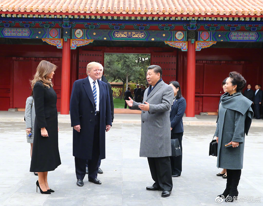新華網(wǎng)北京11月8日電 國(guó)家主席習(xí)近平和夫人彭麗媛8日下午在故宮博物院迎接來華進(jìn)行國(guó)事訪問的美國(guó)總統(tǒng)特朗普和夫人梅拉尼婭。兩國(guó)元首夫婦在寶蘊(yùn)樓簡(jiǎn)短茶敘。
