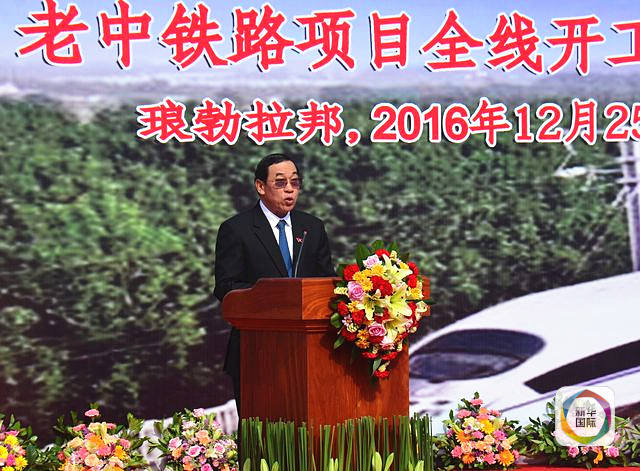 2016年12月25日,老中鐵路項(xiàng)目全線開工儀式在老撾瑯勃拉邦舉行,老撾公共工程與運(yùn)輸部部長奔占·辛塔馮在開工儀式上致辭。(新華社發(fā))