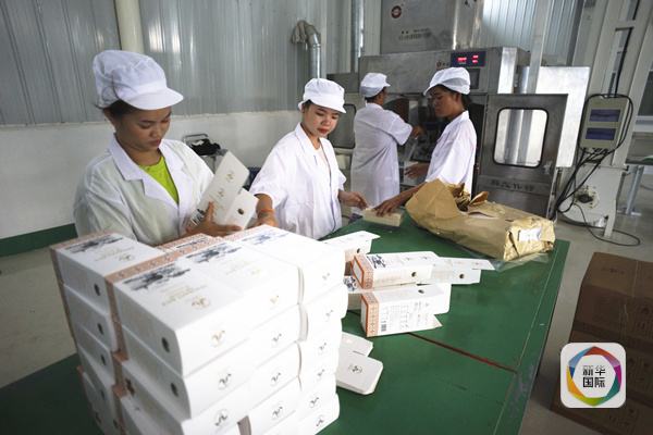 工人正在中資企業(yè)炫燁(老撾)有限公司的生產(chǎn)車間內(nèi)包裝老撾大米。(新華社記者凌朔攝)