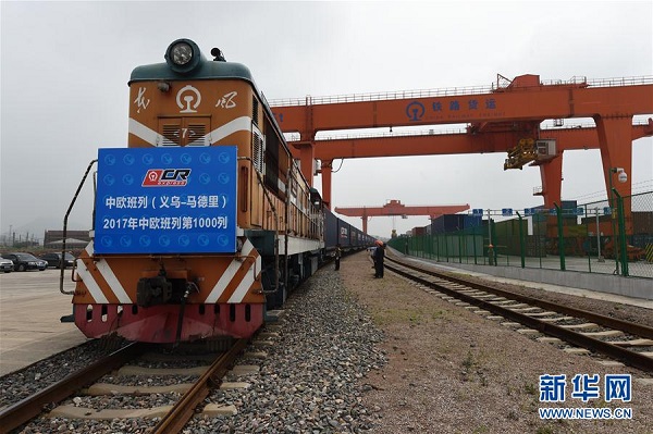 5月13日,2017年第1000列中歐班列從義烏西站駛出。當日,X8024次中歐班列(義烏-馬德里)從浙江義烏鐵路西站鳴笛駛出。這列滿載小商品、服裝等貨物的列車是2017年開行的第1000列中歐班列。中國鐵路總公司統(tǒng)計顯示,2017年中歐班列開行數(shù)量較去年同期增加612列,增長158%。新華社發(fā)(龔獻明 攝)