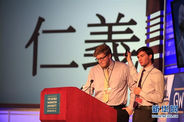 11月18日,在美國首都華盛頓的喬治·華盛頓大學(xué),參賽選手進行中文演講。美國喬治·華盛頓大學(xué)中國學(xué)生學(xué)者聯(lián)合會和喬治·華盛頓大學(xué)孔子學(xué)院聯(lián)合主辦的第一屆“華語擂臺”漢語辯論賽18日落下帷幕。來自賓夕法尼亞州、猶他州、佛羅里達州等美國多地的10名參賽者兩兩組隊,通過成語挑戰(zhàn)、現(xiàn)場問答和團隊辯論三種形式,展示了各自的漢語知識、語言和思辨能力及個人風(fēng)采。新華社記者 楊承霖 攝