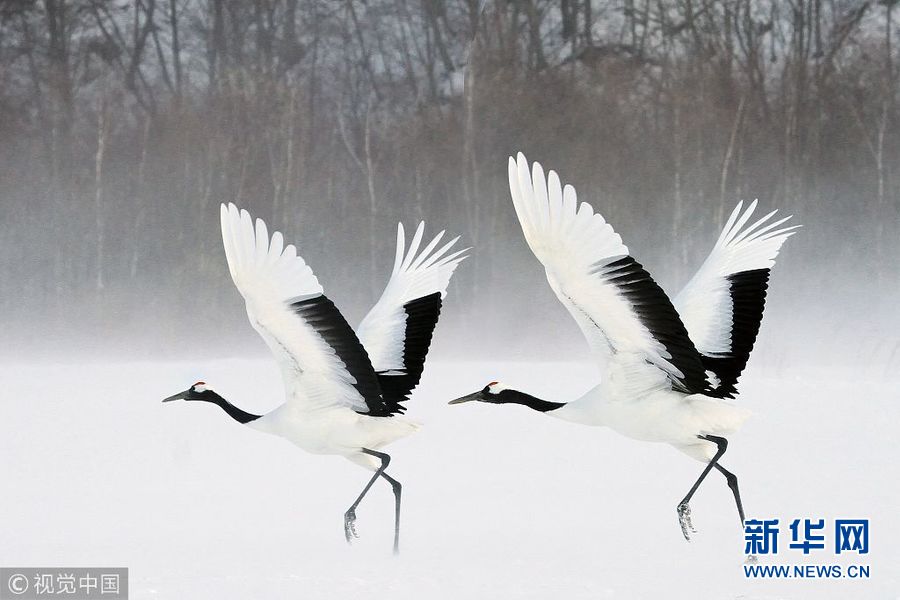 12月25日訊(具體拍攝時(shí)間不詳),日本北海道,一對(duì)丹頂鶴在冰面上翩翩起舞,動(dòng)作驚人一致。(圖片來(lái)源:視覺中國(guó))