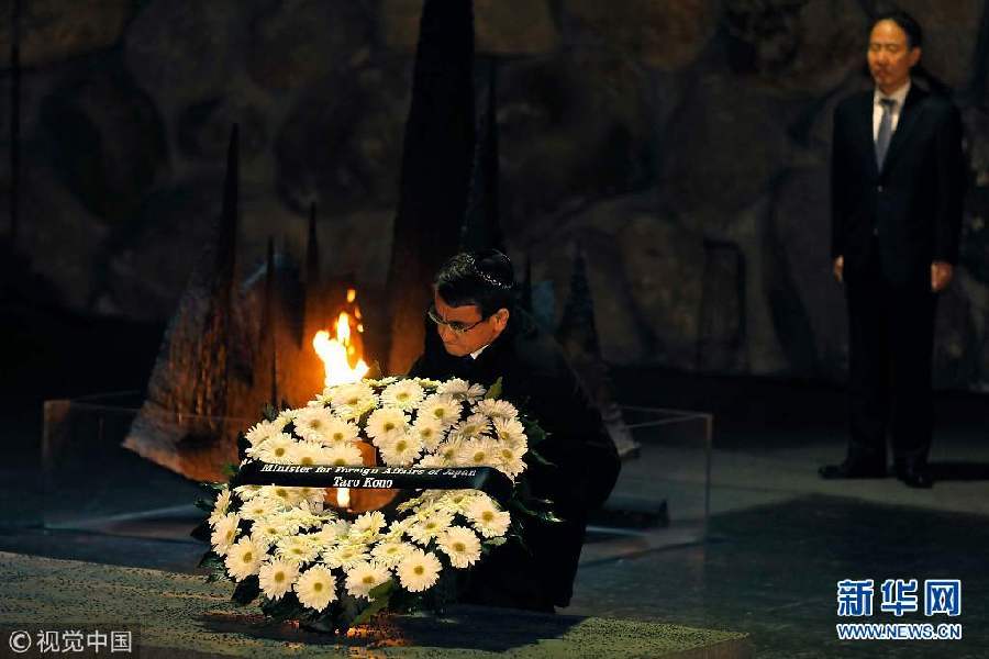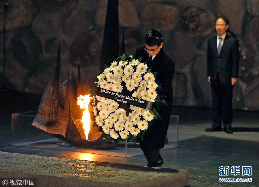 12月25日,耶路撒冷,日本外相河野太郎訪問耶路撒冷,參觀大屠殺紀念館,獻花悼念死難者。 (圖片來源:視覺中國)