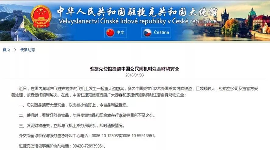 中國駐捷克使館提醒廣大游客和旅捷僑胞乘機(jī)時(shí)注意自身財(cái)物安全: