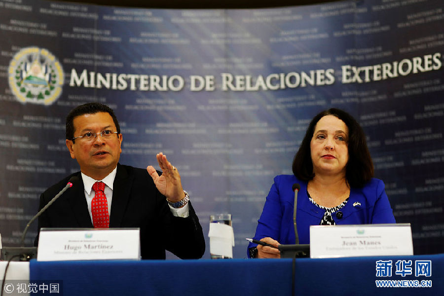 當(dāng)?shù)貢r間2018年1月8日,薩爾瓦多圣薩爾瓦多,美國駐薩爾瓦多大使Jean Manes(右)與薩爾瓦多外交部長雨果·馬丁內(nèi)斯出席新聞發(fā)布會。(圖片來源:視覺中國)