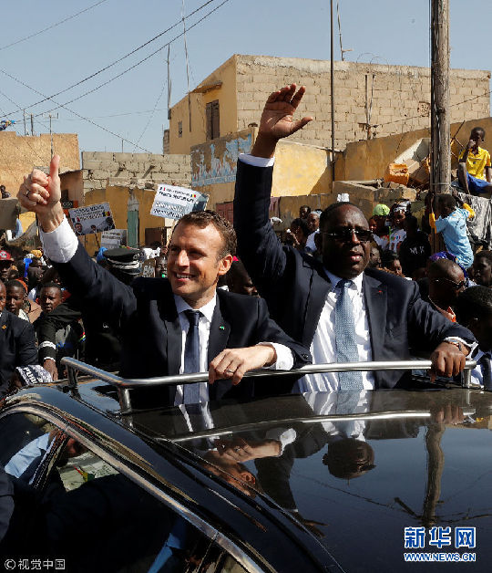 當(dāng)?shù)貢r(shí)間2月3日,塞內(nèi)加爾圣路易,塞內(nèi)加爾總統(tǒng)馬基·薩勒陪到訪的法國(guó)總統(tǒng)馬克龍?jiān)煸L當(dāng)?shù)?,兩人乘車向民眾致意。(圖片來(lái)源:視覺(jué)中國(guó))