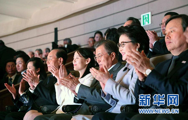 2月11日,在韓國(guó)首爾,韓國(guó)總統(tǒng)文在寅(右三)與朝鮮最高人民會(huì)議常任委員會(huì)委員長(zhǎng)金永南(右五)和朝鮮勞動(dòng)黨中央委員會(huì)第一副部長(zhǎng)金與正(右四)共同觀看演出。新華社/紐西斯通訊社