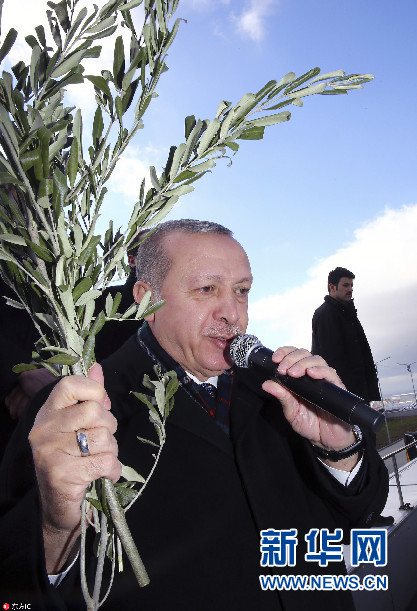 當(dāng)?shù)貢r(shí)間2018年2月17日,土耳其埃斯基謝希爾,土耳其總統(tǒng)埃爾多安出席正義與發(fā)展黨集會(huì),手持橄欖枝發(fā)表講話。(圖片來(lái)源:東方IC)
