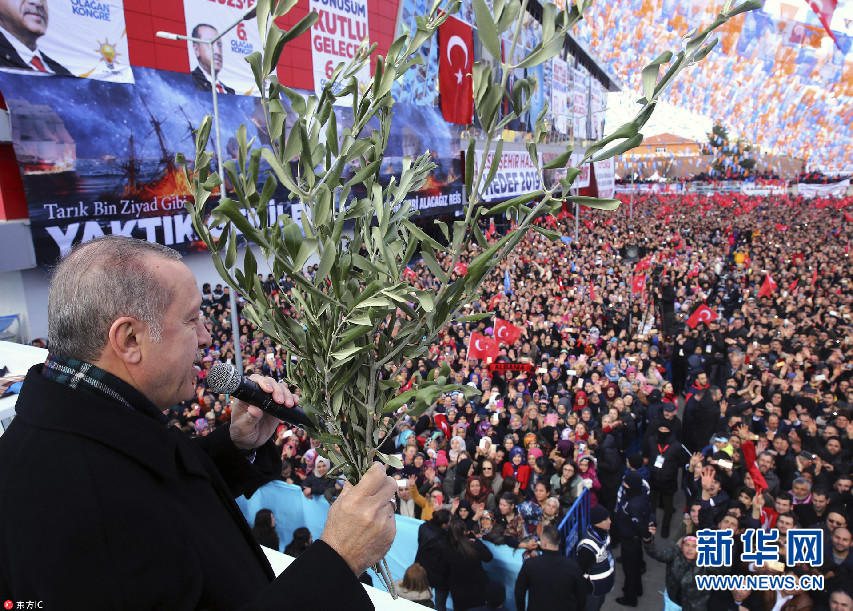 當(dāng)?shù)貢r(shí)間2018年2月17日,土耳其埃斯基謝希爾,土耳其總統(tǒng)埃爾多安出席正義與發(fā)展黨集會(huì),手持橄欖枝發(fā)表講話。(圖片來(lái)源:東方IC)