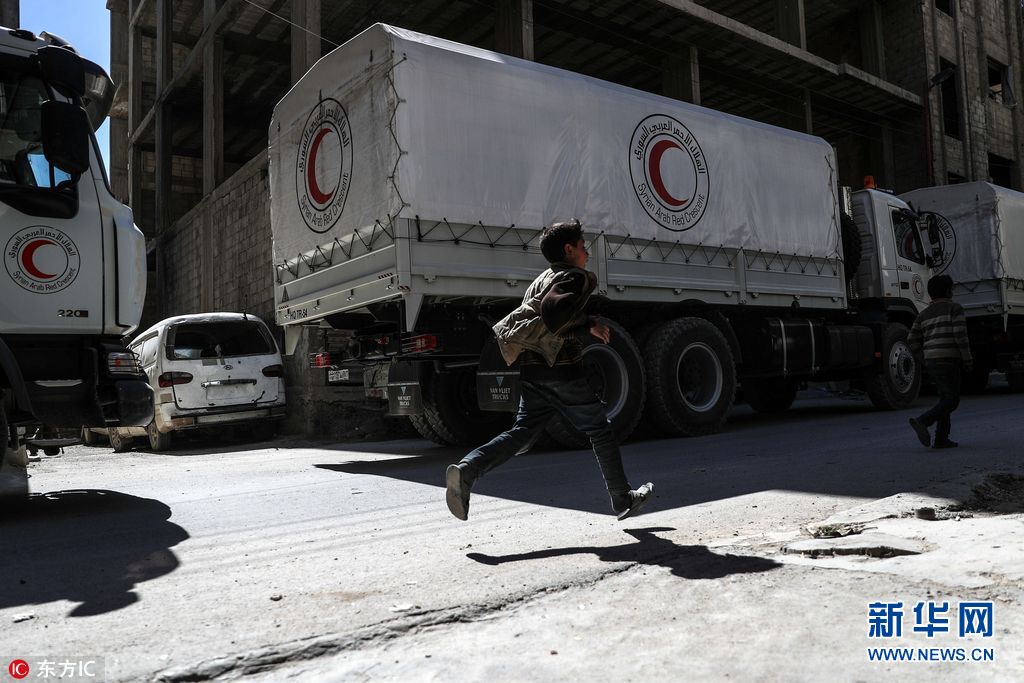 當地時間2018年3月9日,敘利亞,推遲多日后,人道主義救援物資進入東古塔反政府武裝控制區(qū)并完成卸貨,共13卡車物資當天上午從瓦菲丁通道進入杜馬區(qū)。(圖片來源:東方IC)