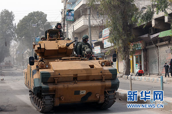 3月24日,在敘利亞阿夫林,一輛土耳其裝甲車在城區(qū)駛過。新華社發(fā)