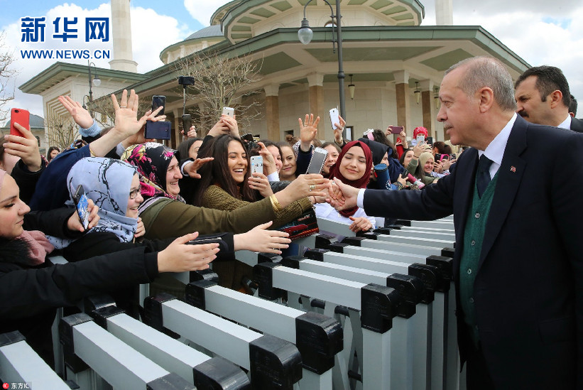 當?shù)貢r間3月30日,土耳其安卡拉,土耳其總統(tǒng)埃爾多安在星期五禮拜結(jié)束后與民眾打招呼。(圖片來源:東方IC)