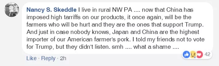 我住在賓州西北部農(nóng)村…中國(guó)已對(duì)我們的產(chǎn)品加征關(guān)稅,曾支持特朗普的農(nóng)民會(huì)再次受傷……我告訴過(guò)我的朋友不要給特朗普投票,但他們不聽(tīng)。哎,太無(wú)語(yǔ)了……