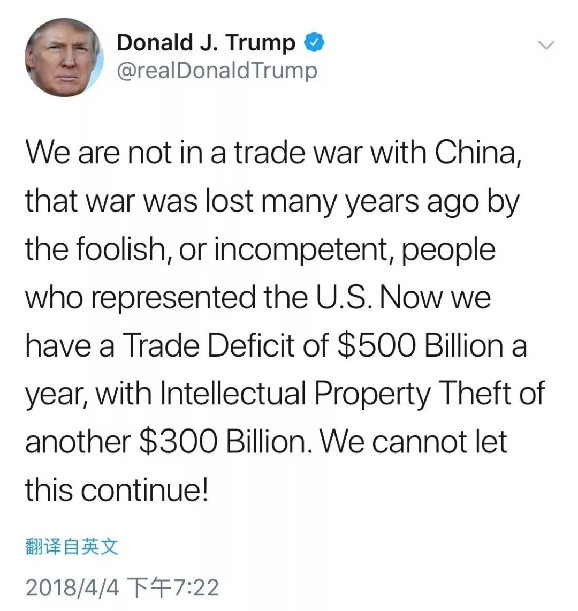“我們沒(méi)有和中國(guó)打貿(mào)易戰(zhàn),這場(chǎng)戰(zhàn)爭(zhēng)多年前就被當(dāng)時(shí)代表美國(guó)的那些愚蠢無(wú)能的人打輸了?,F(xiàn)在我們一年有5000億美元的貿(mào)易逆差,另有3000億美元知識(shí)產(chǎn)權(quán)被竊。我們不能讓這一切繼續(xù)!”