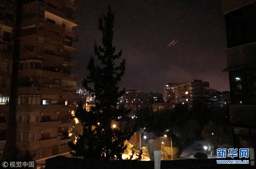4月14日,敘利亞大馬士革,特朗普決定聯(lián)合英國和法國對敘利亞進(jìn)行精確打擊,大馬士革傳出爆炸聲,敘利亞方面進(jìn)行反擊。敘利亞阿拉伯?dāng)⒗麃喭ㄓ嵣?SANA)報(bào)道,敘政府軍在大馬士革以南地區(qū)擊落13枚導(dǎo)彈。敘利亞國家電視臺此前稱美英法三國對敘利亞“發(fā)動了侵略”。(圖片來源:視覺中國)