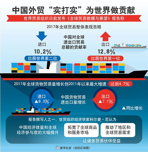 世界貿(mào)易組織日前發(fā)布《全球貿(mào)易數(shù)據(jù)與展望》報告稱,2017年全球貿(mào)易整體表現(xiàn)亮眼,中國對全球進(jìn)出口貿(mào)易總額的貢獻(xiàn)率高達(dá)10.2%和12.8%,分別位居世界第二和第一位。這再次表明,作為世界第一大貨物貿(mào)易國,中國已成為拉動全球貿(mào)易巨輪前行的重要推動力。