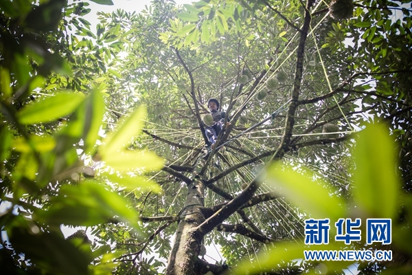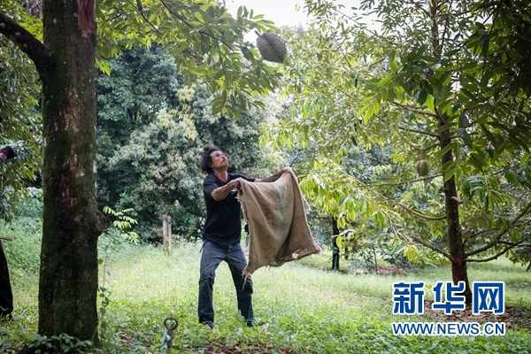 新華網(wǎng)曼谷4月24日電(陳家寶)23日清晨,在泰國(guó)曼谷以東約250公里的莊他武里府的果園里,綴滿榴蓮的高樹上,黝黑的果農(nóng)爬上枝椏,割下一個(gè)個(gè)約3公斤重的果實(shí)。