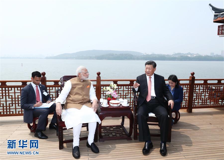 4月27日和28日,國家主席習(xí)近平在武漢東湖賓館同印度總理莫迪舉行非正式會(huì)晤。這是4月28日,習(xí)近平同莫迪交談。 新華社記者 龐興雷攝