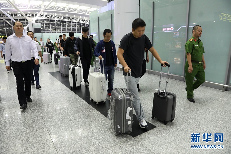 4月28日,嫌疑人在中越警方押送下進(jìn)入越南河內(nèi)內(nèi)排國際機場。當(dāng)日,越南警方在河內(nèi)內(nèi)排國際機場向中國警方工作組移交了許某等8名涉嫌詐騙罪的在逃嫌疑人。中國警方“獵狐行動”在越南再獲新成果。新華社記者王迪攝