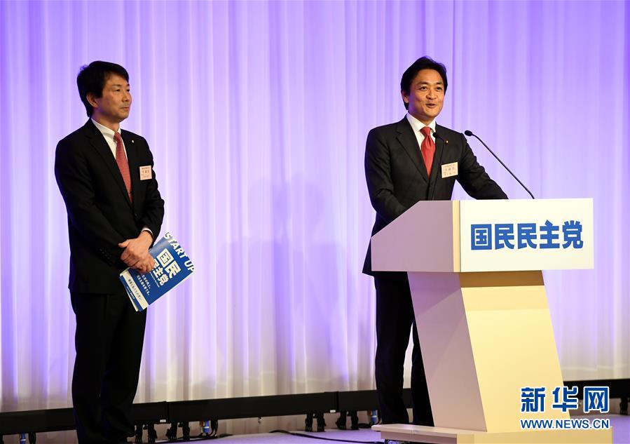 5月7日,日本在野黨希望之黨黨首玉木雄一郎(右)在東京舉行的國民民主黨建黨大會上講話。新華社記者馬平攝