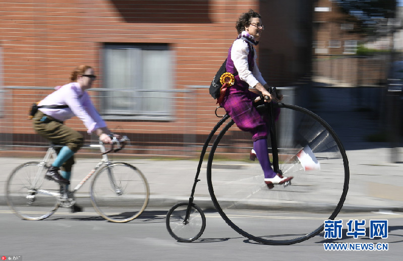 當(dāng)?shù)貢r(shí)間2018年5月5日,英國倫敦,當(dāng)?shù)嘏e辦復(fù)古騎行活動(dòng),民眾身穿花呢子服裝騎車穿行在倫敦街頭。今年是該活動(dòng)舉辦十周年。(圖片來源:東方IC)
