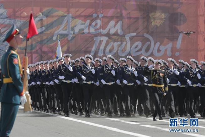 5月9日,在俄羅斯圣彼得堡,俄軍士兵參加閱兵式。5月9日是俄羅斯衛(wèi)國(guó)戰(zhàn)爭(zhēng)勝利紀(jì)念日。 新華社發(fā)(莫京娜攝)
