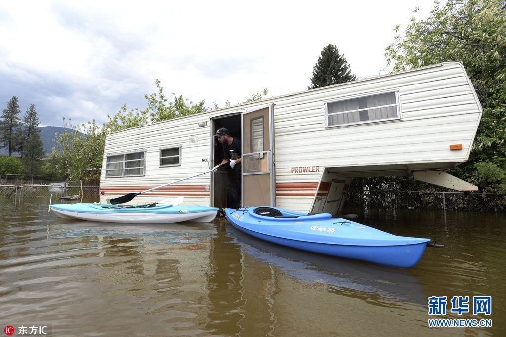 5月17日,加拿大不列顛哥倫比亞省Grand Forks,當?shù)卦夂樗u擊,房屋、車輛浸泡水中。(圖片來源:東方IC)