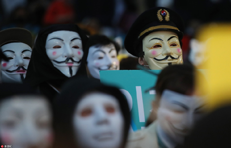 當(dāng)?shù)貢r(shí)間2018年5月18日,韓國(guó)首爾,大韓航空有限公司的飛行員戴著蓋伊·??怂姑婢撸谑谞柺袇^(qū)集會(huì)抗議,反對(duì)大韓航空會(huì)長(zhǎng)兼首席執(zhí)行官趙亮鎬及其家庭。