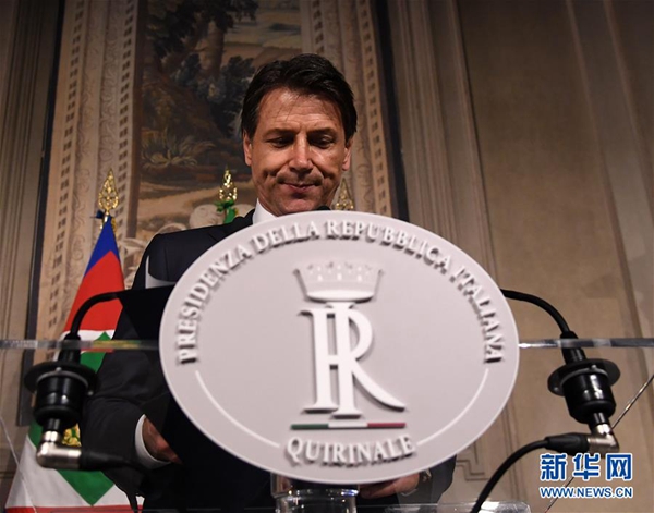 5月27日,在意大利首都羅馬,意新任總理孔特發(fā)表講話。據(jù)當(dāng)?shù)孛襟w報(bào)道,孔特27日晚間與總統(tǒng)馬塔雷拉會(huì)面并提交擬定的內(nèi)閣成員名單時(shí),馬塔雷拉否決了由意大利聯(lián)盟黨和五星運(yùn)動(dòng)力推的持疑歐立場(chǎng)的經(jīng)濟(jì)學(xué)家保羅·薩沃納出任財(cái)政部長(zhǎng)。孔特向總統(tǒng)提出放棄組閣任務(wù)請(qǐng)求,請(qǐng)求得到總統(tǒng)確認(rèn)。新華社發(fā)(阿爾貝托·林格里亞攝)