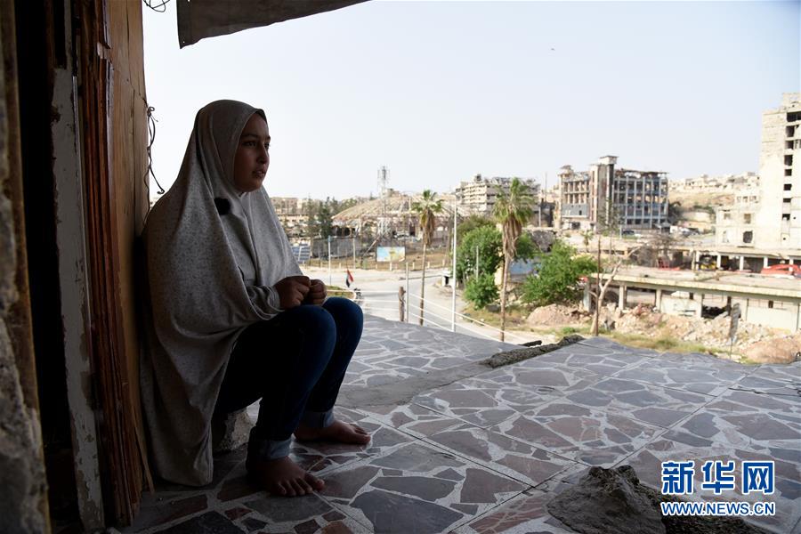 5月6日,在敘利亞阿勒頗,阿明娜坐在沒有圍欄的陽臺上。新華社發(fā)(胡馬姆·謝赫·阿里 攝)