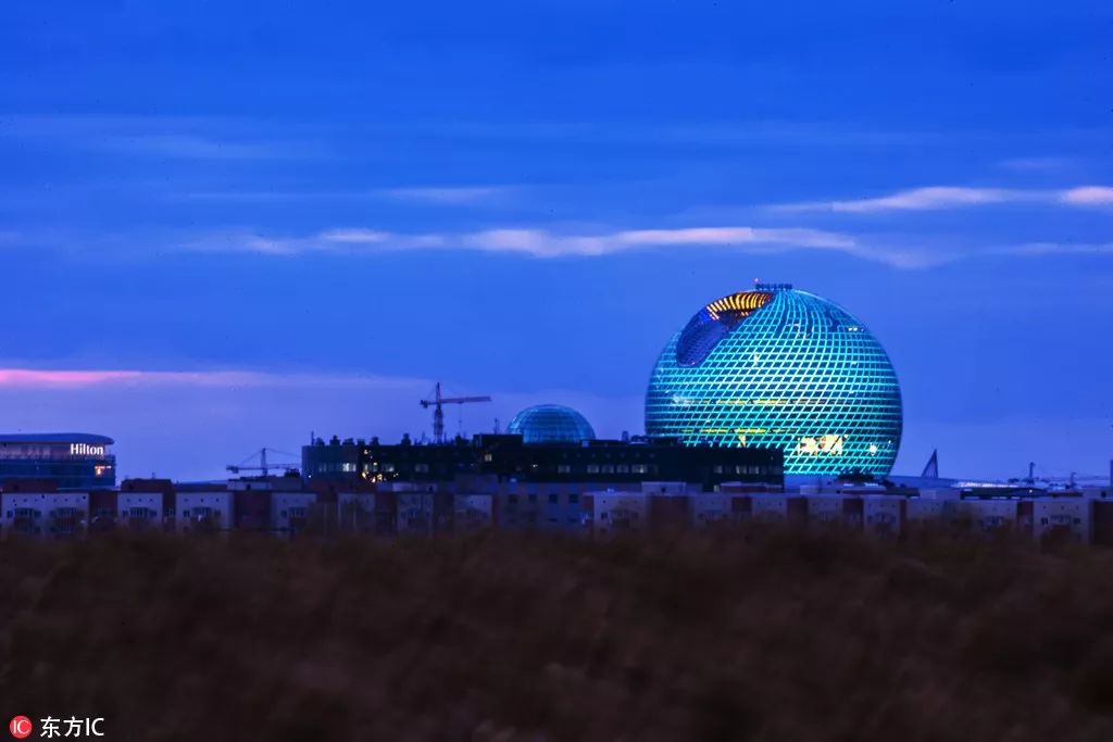 哈薩克斯坦阿斯塔納世博會(huì)主場館夢幻夜景,當(dāng)今世界最大玻璃球形建筑。