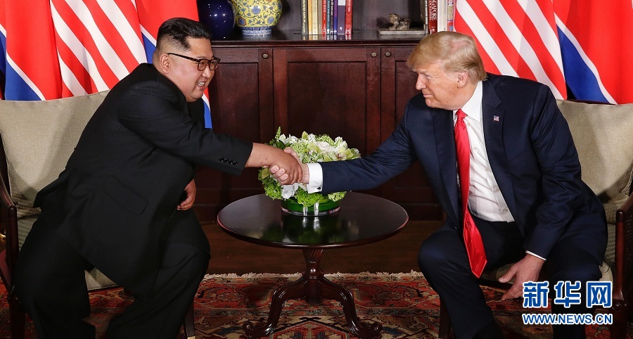 6月12日,朝鮮最高領(lǐng)導(dǎo)人金正恩(左)與美國總統(tǒng)特朗普在新加坡舉行會晤。 新華社發(fā)(新加坡通訊及新聞部供圖)