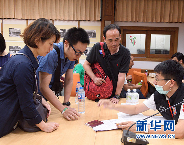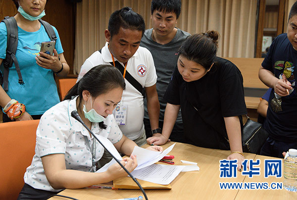 7月9日,在泰國普吉島的哇集拉醫(yī)院,來自蘇梅島的旅游警察志愿者(右)幫助遇難者家屬做確認遺體登記工作。新華社記者 秦晴 攝