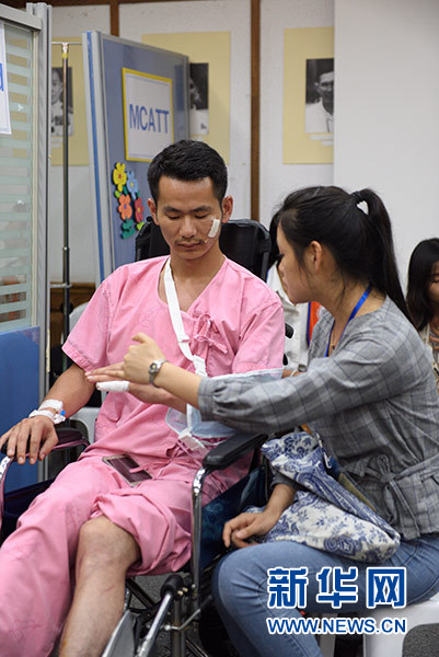 7月9日,在泰國普吉島的哇集拉醫(yī)院,一名華人志愿者(右)指導中國受傷游客活動手指關節(jié)。新華社記者 秦晴 攝
