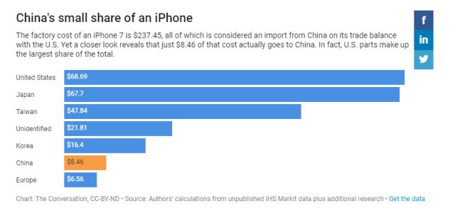 他們給出的理由則既簡(jiǎn)單又引人矚目:“因?yàn)橹袊?guó)每出口一個(gè)iPhone給美國(guó),只收入8.46美元”。