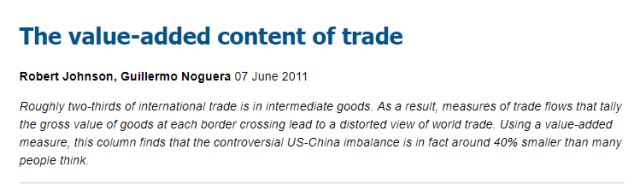 這家美國(guó)智庫(kù)的觀點(diǎn),也得到了來(lái)自歐洲的智庫(kù)“經(jīng)濟(jì)政策研究中心”2011年一篇報(bào)告的佐證。報(bào)告中的數(shù)據(jù)就顯示,如果貿(mào)易逆差是按照各個(gè)國(guó)家在產(chǎn)品中實(shí)際的“附加價(jià)值”計(jì)算的話,那么中美的貿(mào)易逆差將會(huì)大大縮減40%甚至更多。