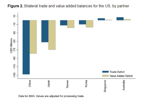 更引人注目的是,如此計(jì)算的話,那么比如2004年時(shí)日本和美國(guó)的貿(mào)易逆差就會(huì)暴增33%,直接逼近當(dāng)時(shí)中美按這種算法得出的貿(mào)易逆差了——畢竟,在不少中國(guó)出口給美國(guó)的產(chǎn)品中,擁有專利技術(shù)的日本的“附加價(jià)值”是很高的。