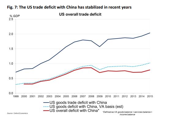 別看這個(gè)歐洲智庫(kù)的數(shù)據(jù)有點(diǎn)舊,在2018年的今天,情況還是一樣一樣的。美國(guó)CNBC上個(gè)月的一篇報(bào)道中就引用了來(lái)自牛津大學(xué)的數(shù)據(jù)稱,如果按照各國(guó)實(shí)際在貿(mào)易中的“附加價(jià)值”計(jì)算,中美現(xiàn)在3700億的貿(mào)易逆差會(huì)縮小一半之巨,即從美國(guó)GDP的2%縮小到1%——這已經(jīng)與歐盟相當(dāng)了。