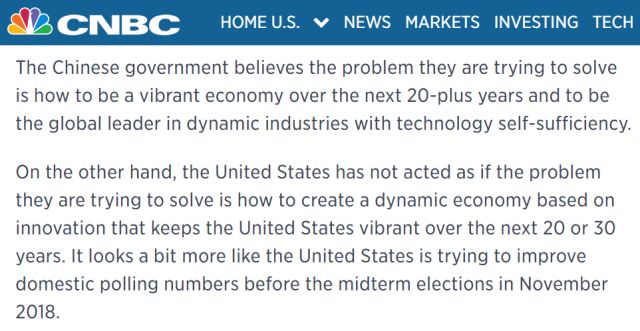 特朗普真正在意的問(wèn)題,并不是創(chuàng)造一個(gè)活躍創(chuàng)新的經(jīng)濟(jì),好讓美國(guó)在未來(lái)20-30年繼續(xù)保持領(lǐng)先,他在乎的只是11月中期選舉的投票數(shù)字;另一方面,中國(guó)政府在意的問(wèn)題,反倒是如何令其經(jīng)濟(jì)在接下來(lái)的20年里保持活力,從而令中國(guó)成為一個(gè)引領(lǐng)世界、科技上自主獨(dú)立的國(guó)家。