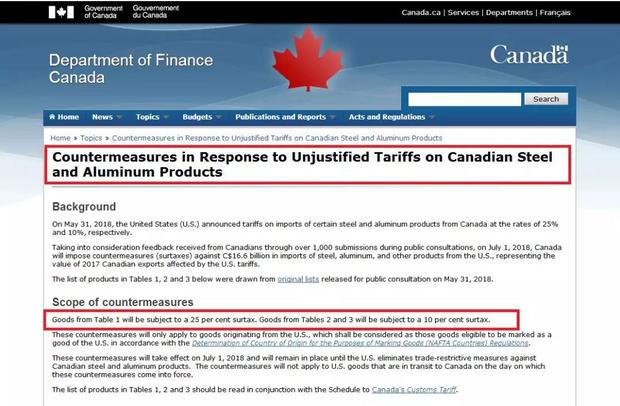加拿大財政部官網(wǎng)發(fā)布的公告,標題可以說是相當?shù)刂笔阈匾芰耍骸秾幽么箐撲X產(chǎn)品受到不公平關(guān)稅待遇的反擊措施》(Countermeasures in Response to Unjustified Tariffs on Canadian Steel and Aluminum Products)。抱怨三連:countermeasures(對抗措施), in Response to(對……做出反應(yīng)),unjustified(不公平的)——看得出,加拿大是真生氣了。