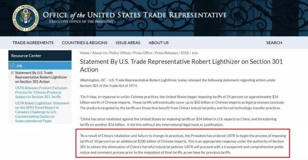 第二,強調(diào)中國不聽勸,未按其要求“限期整改”——聲明稱,過去一年,特朗普政府“耐心”敦促中國停止原有做法、開放市場、參與真正的市場競爭,并給出了“清晰和詳細(xì)”的具體改變要求,但中國“并未改變令美國經(jīng)濟(jì)未來處于風(fēng)險的行為”,反而開始報復(fù)美國產(chǎn)品,這樣做“缺乏任何國際法理基礎(chǔ)或理由”。所以他們覺得,原有的力度不夠了,要再加加碼,“這是美國在301條款授權(quán)下對消除中國‘有害’產(chǎn)業(yè)政策做出的合適回應(yīng)”。(就奇怪怎么這個301條款哪兒哪兒都好使?)