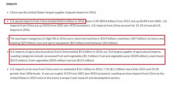 首先,從中方向美方的出口結(jié)構(gòu)來看:2016年美國從中國進(jìn)口總值4626億美元,是美國最大的商品供給方。進(jìn)口額最高的是電子機(jī)械類產(chǎn)品(1290億美元),機(jī)器(970億美元),家具及寢具(290億美元),玩具及運動裝備(240億美元),鞋類(150億美元)。此外,從中國進(jìn)口的農(nóng)產(chǎn)品總額43億美元(這已經(jīng)是美國第三大農(nóng)產(chǎn)品供應(yīng)方了),其中占比最高的是加工后的水果及蔬菜(11億美元),水果及蔬菜汁(3.28億美元),快餐休閑類食品(2.13億美元),新鮮蔬菜(2.05億美元)及茶葉(1.52億美元)。