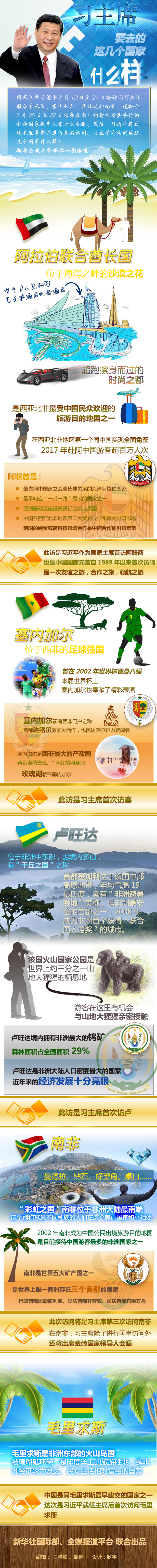 季夏之月,赴萬里之約。7月19日至28日,習(xí)近平主席將對(duì)阿聯(lián)酋、塞內(nèi)加爾、盧旺達(dá)和南非進(jìn)行國(guó)事訪問,出席在南非約翰內(nèi)斯堡舉行的金磚國(guó)家領(lǐng)導(dǎo)人第十次會(huì)晤,過境毛里求斯并進(jìn)行友好訪問。