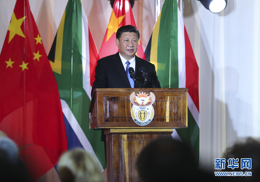 7月24日,國(guó)家主席習(xí)近平在比勒陀利亞出席南非總統(tǒng)拉馬福薩舉行的歡迎習(xí)近平主席對(duì)南非進(jìn)行國(guó)事訪問(wèn)暨慶祝中南建交20周年晚宴。這是習(xí)近平發(fā)表致辭。新華社記者 謝環(huán)馳 攝