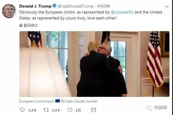 他夸耀和歐盟委員會(huì)主席容克的會(huì)晤“很溫馨”。他還在推特上貼了一張與容克“貼面禮”的照片,并這樣說(shuō):“顯而易見(jiàn),容克所代表的歐盟及你們代表的美國(guó),真的愛(ài)對(duì)方!”