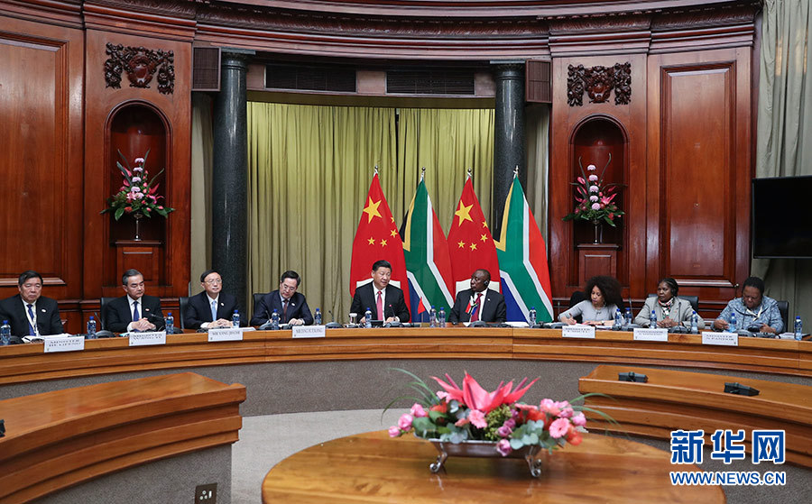 習(xí)主席對(duì)南非進(jìn)行國(guó)事訪問期間,兩國(guó)元首就推進(jìn)新時(shí)期中南全面戰(zhàn)略伙伴關(guān)系達(dá)成重要共識(shí),一致同意加強(qiáng)高層往來,深化政治互信,對(duì)接發(fā)展戰(zhàn)略,推進(jìn)務(wù)實(shí)合作,密切人文交流,讓兩國(guó)人民更多享受中南合作成果。